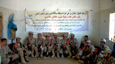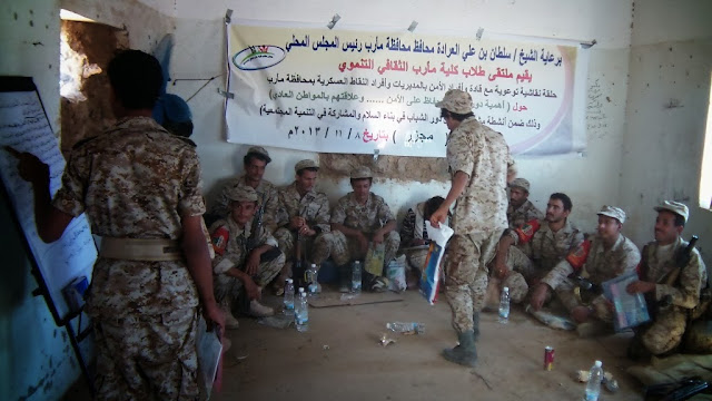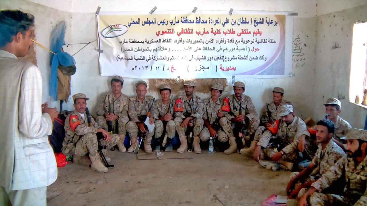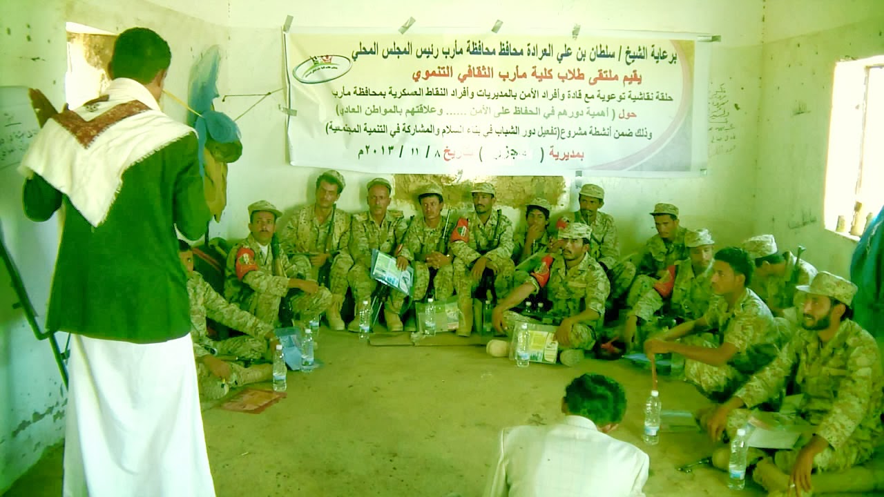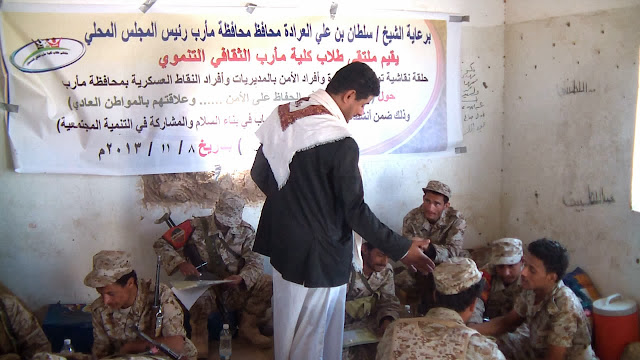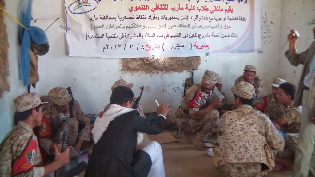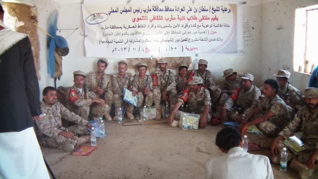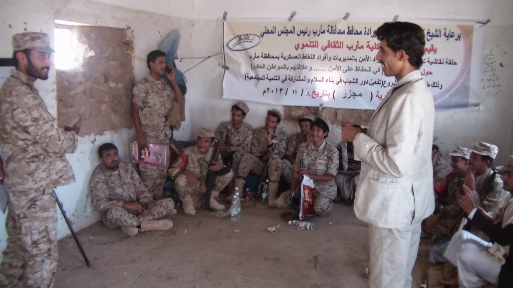 2013م الحلقات النقاشية الاولى و الثانية مع أفراد الامن البواسل في نقاشية وتوعوية مع أفراد الامن البواسل في المديريات المستهدفة و النقاط العسكرية بمحافظة مأرب .