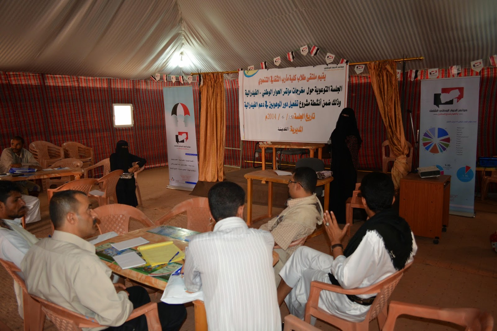 على الجدران منذ ان انطلقة فريق الرسامين ميدانياً يوم الاحد الموافق 15-6-2014 ، انطلق ايضا فريق الميسرين لتنفيذ فعاليات وانشطة المرحلة الثالثة (التوعية عبر جلسات التوعية) لتوعية افراد المجتمع حول النظام الفدرالي ومخرجات الحوار الوطني