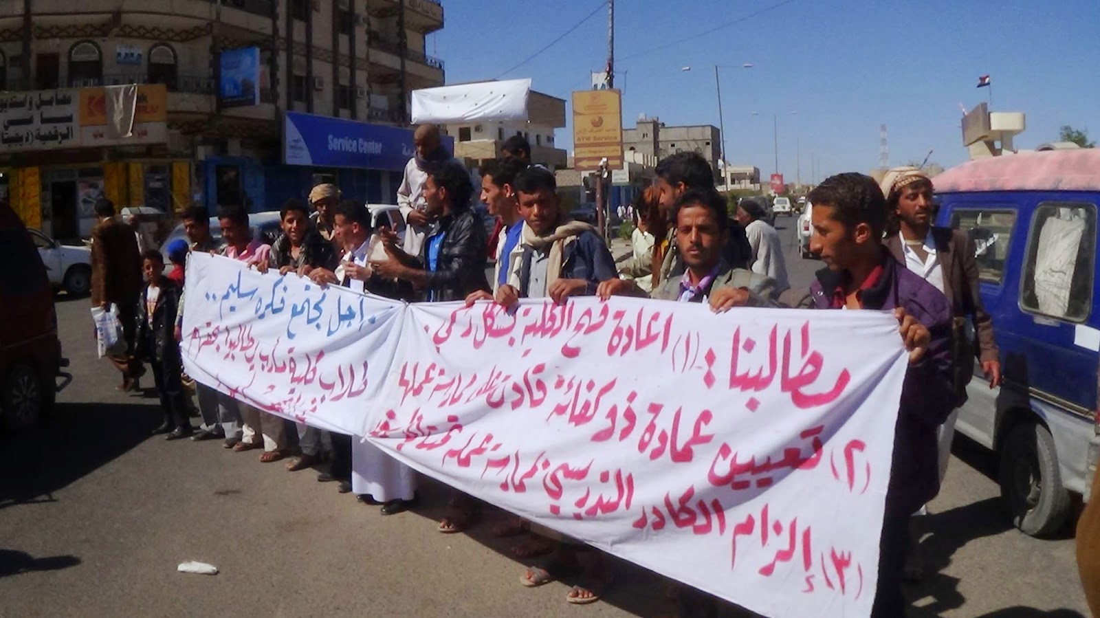 افترشوا الارض والتحفوا السماء في الشارع العام تحديدأ في جوله البنك المركزي وقف الطلاب هناك رافعين شعاراتهم ومطالبهم لمن هب ودب في رسالة منهم للجميع مفادها اننا قديأسنا ،، سئمنا كذب ووعود من قيادات المحافظه ورئاسة الجامعه طرقنا كل الابواب استخدمنا شتى الوسائل والطرق في التعبير عن مطالبنا وحقوقنا لكن للاسف الشديد الضمائر ماتت وقلوب اولوا الشأن قست فاصبحت كالحجاره بل اشد قليلا لم يعد لنا الا الشارع فاتيناه ربما نجد فيه مخرج وحل لقضايانا ،،، من ينصفنا من يرق قلبه لمصير ما يقارب الف طالب مستقبلهم مهدد بالضياع ،،، من يعيد الدراسه لكليتنا بعد 9 اشهر من التوقف والانقطاع ،،،